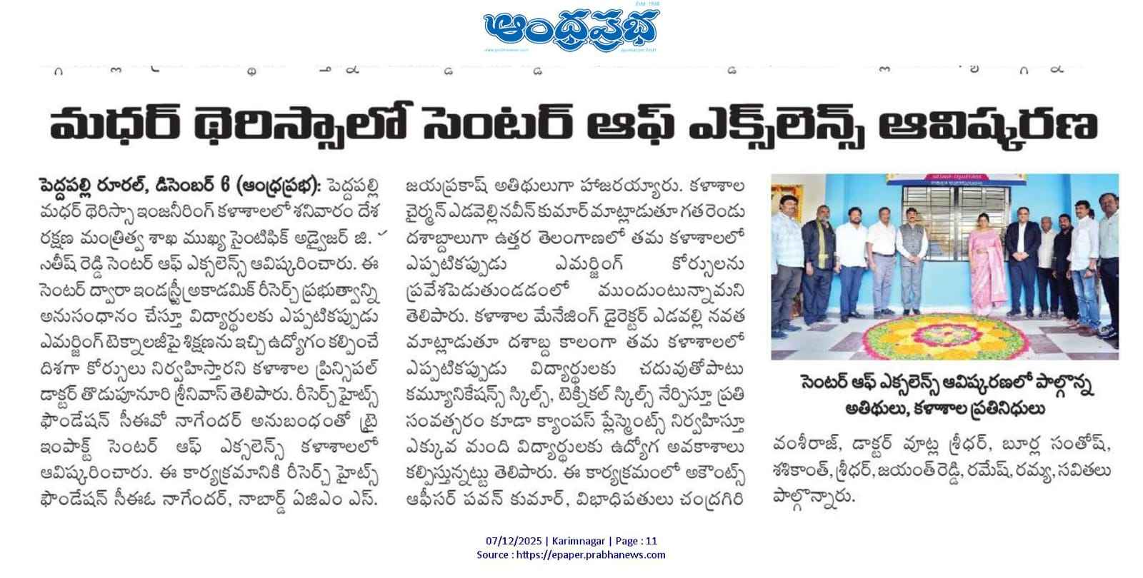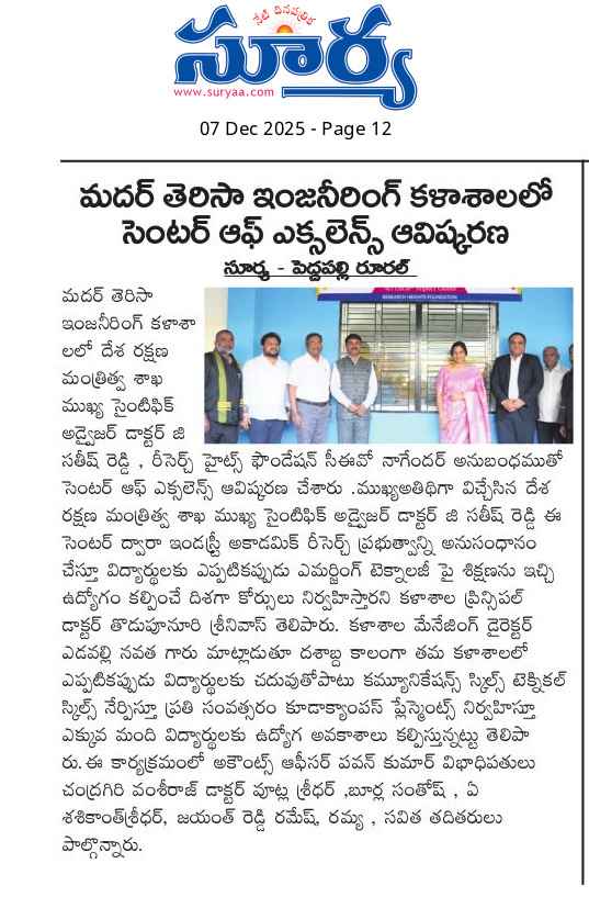 The TRIIMPACT SDG Centre of Excellence, a flagship initiative of Research Heights Foundation (RHF), was inaugurated at Mother Theresa College of Engineering & Technology (MTEC), Peddapalli — marking a major milestone in strengthening sustainability, research, innovation, and community development across higher-education institutions in Telangana.