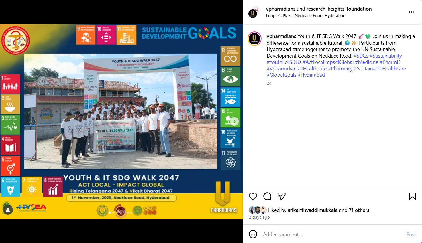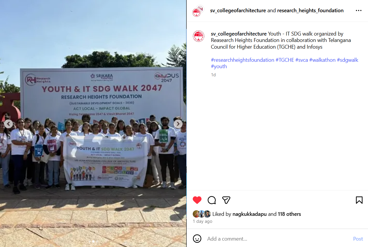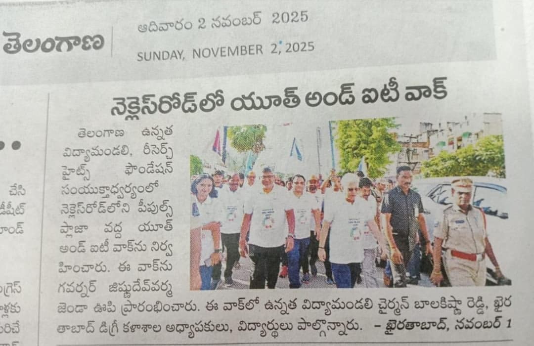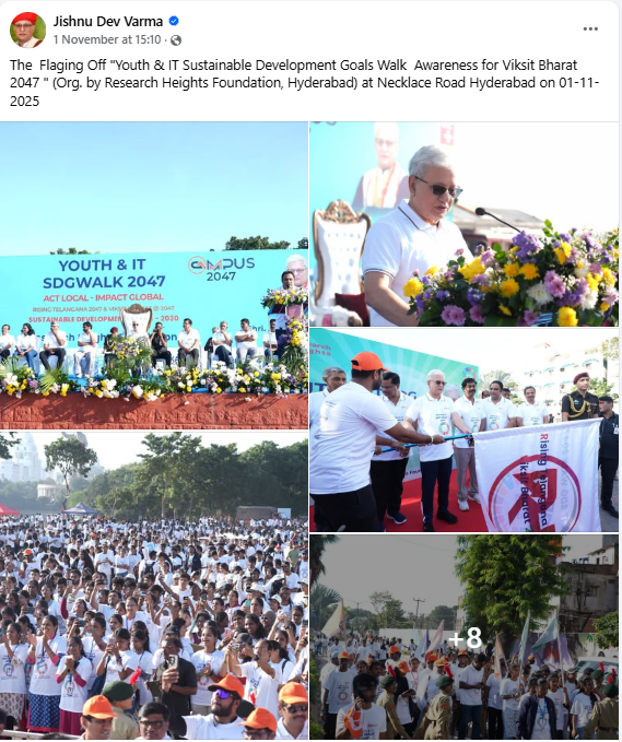 The Youth & IT SDG Walk 2047, organized by Research Heights Foundation (RHF) in collaboration with the Telangana Council of Higher Education (TGCHE), transformed Necklace Road, Hyderabad, into a vibrant sea of youth energy, purpose, and hope on 1st November 2025.