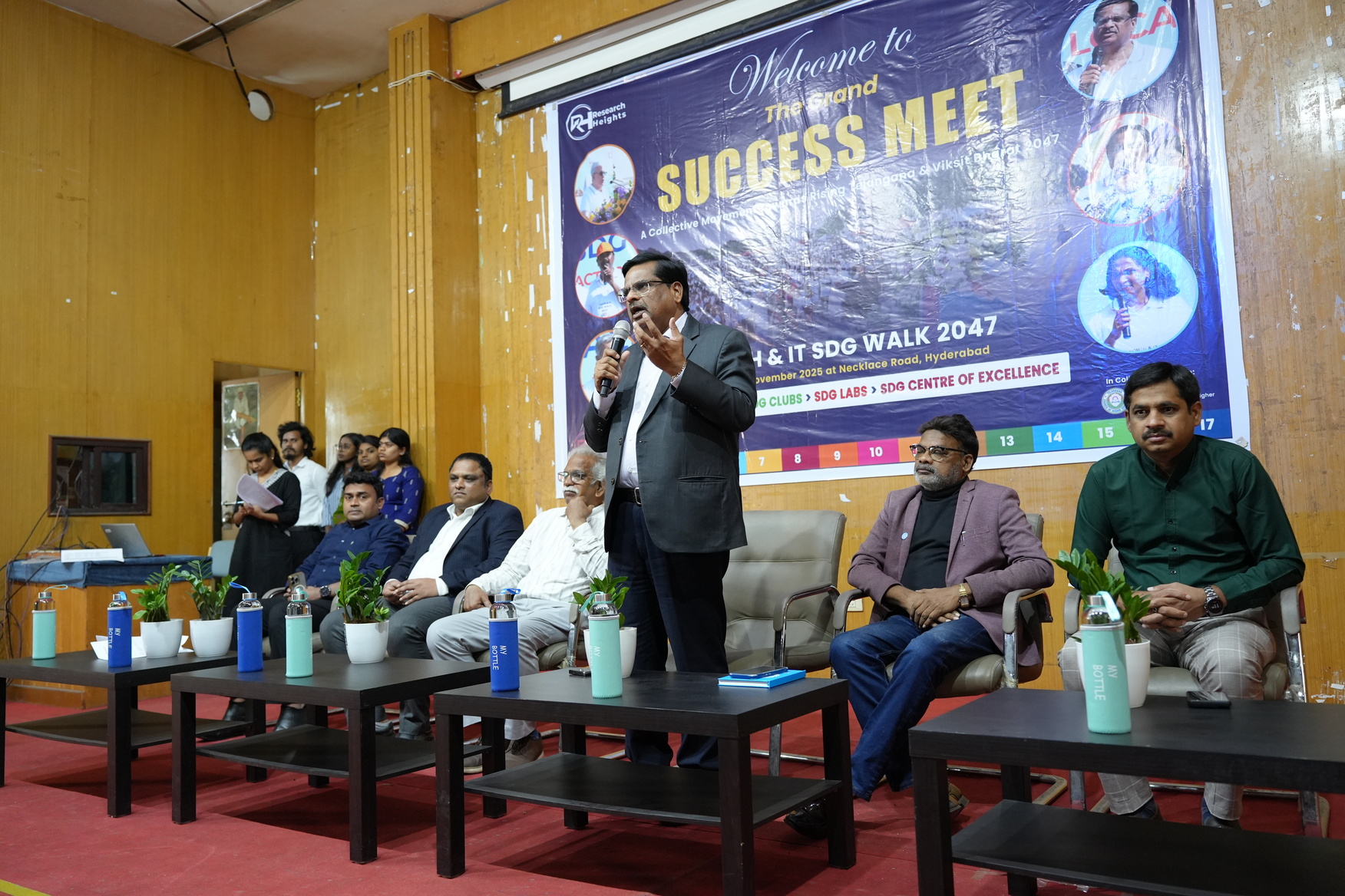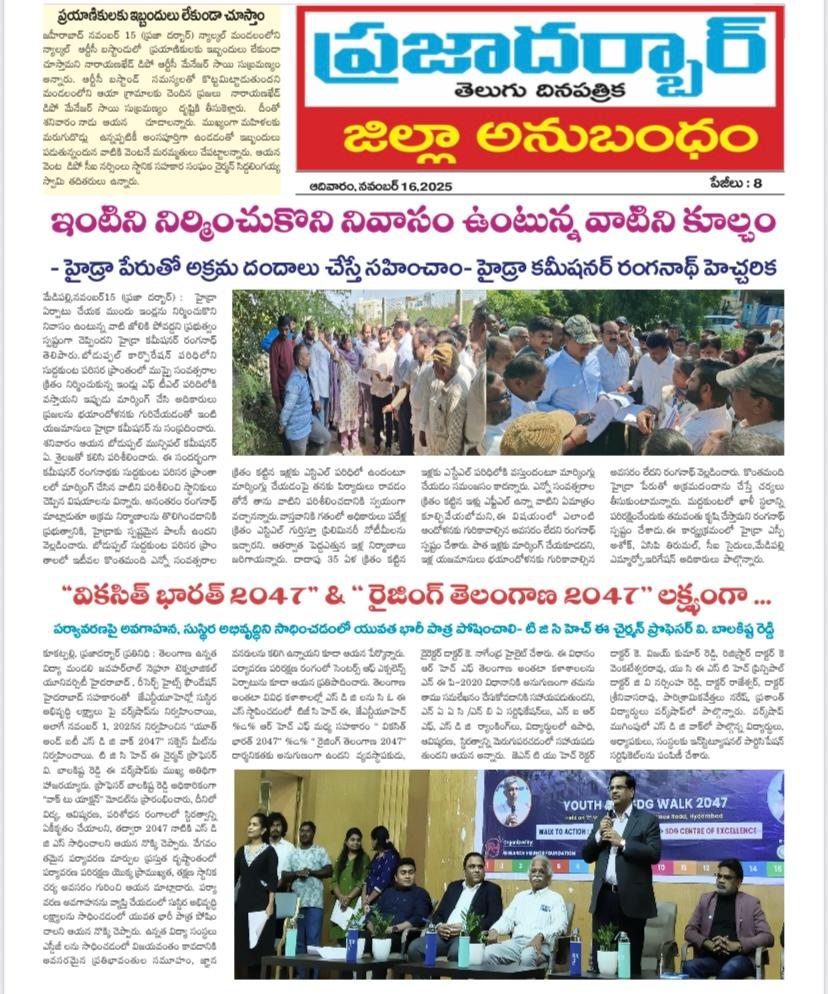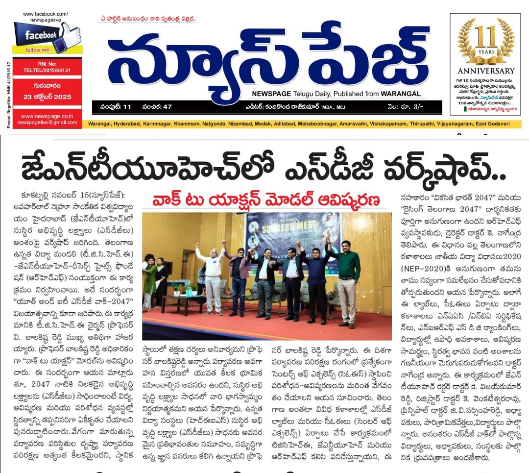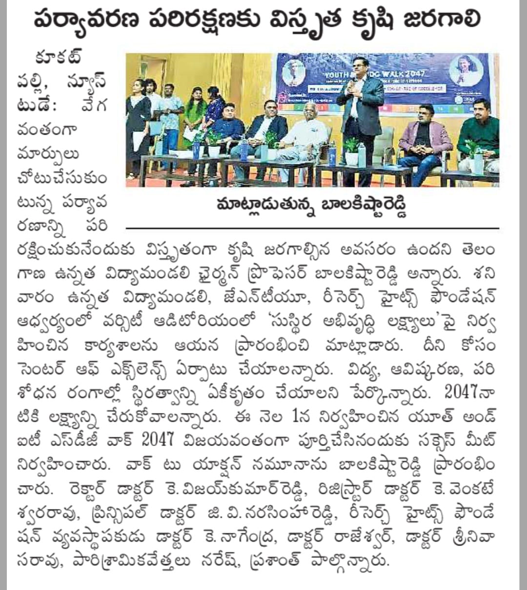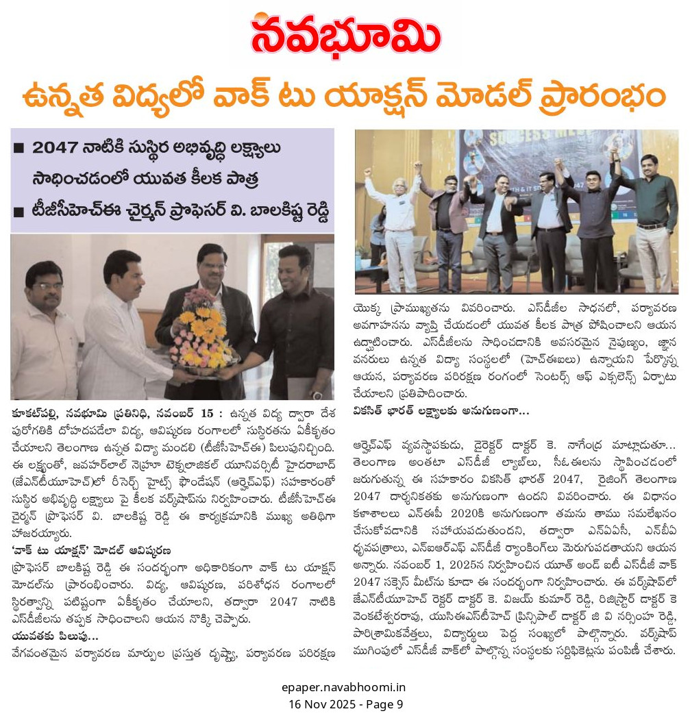 The Research Heights Foundation, in collaboration with TGCHE and JNTUH, successfully organized the Grand Success Meet of the Youth & IT SDG Walk 2047 at the JNTUH UGC Auditorium. Representatives from various institutions—including Deans, Directors, Principals, Faculty Members, NSS/NCC Coordinators, and SDG Ambassadors—participated and were formally recognized for their contribution to the SDG Walk. Certificates were presented by the Chairman of TGCHE, appreciating each institution’s commitment to the SDGs and support for youth-led development initiatives.