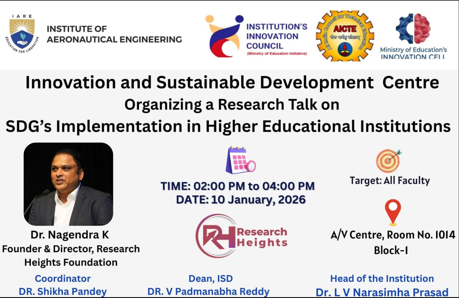 Research Heights Foundation (RHF) conducted a strategic Research Excellence & SDG Integration Engagement at Institute of Aeronautical Engineering (IARE), Hyderabad, reinforcing the institution’s growing emphasis on research-led education, innovation, and global responsibility. The session was designed to align IARE’s strong engineering and technology ecosystem with the UN Sustainable Development Goals through structured academic and research-driven pathways.