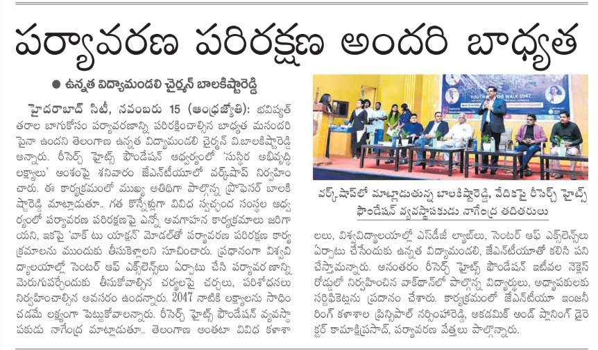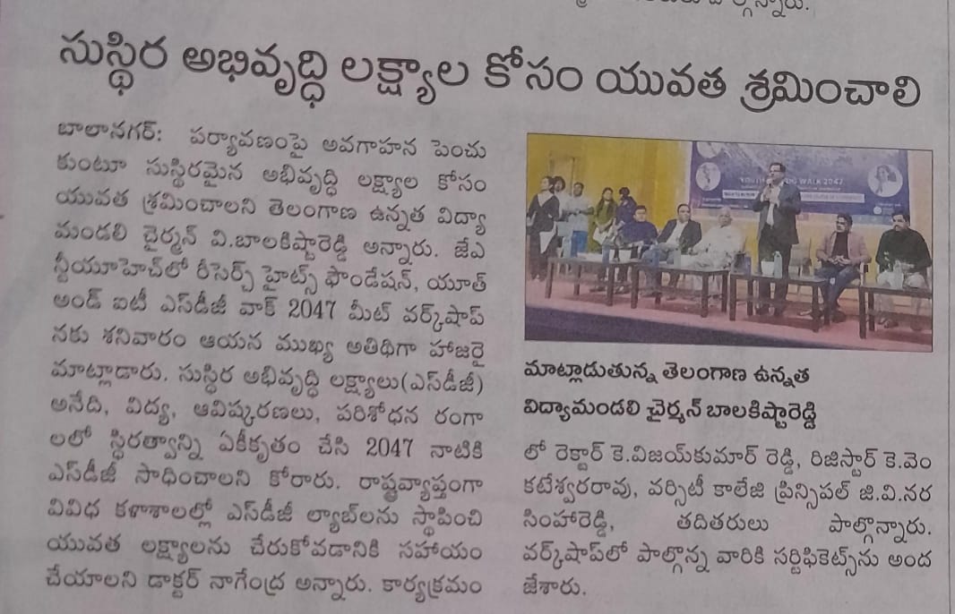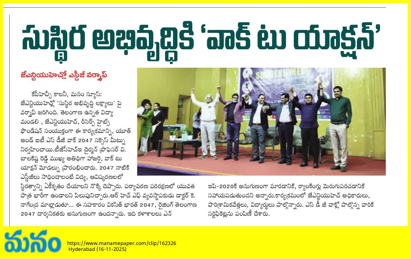 The Research Heights Foundation, in collaboration with TGCHE and JNTUH, successfully organized the Grand Success Meet of the Youth & IT SDG Walk 2047 at the JNTUH UGC Auditorium. Representatives from various institutions—including Deans, Directors, Principals, Faculty Members, NSS/NCC Coordinators, and SDG Ambassadors—participated and were formally recognized for their contribution to the SDG Walk. Certificates were presented by the Chairman of TGCHE, appreciating each institution’s commitment to the SDGs and support for youth-led development initiatives.
